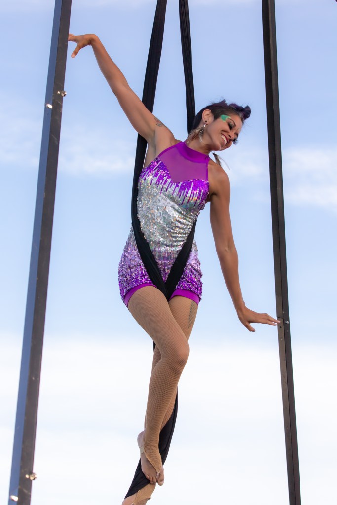 - Bring one foot out to the side, around the silks, continuing to swivel the ankle, to bring the toes and foot to the outside of the silk, flex foot (as in the beginning of French Climb)